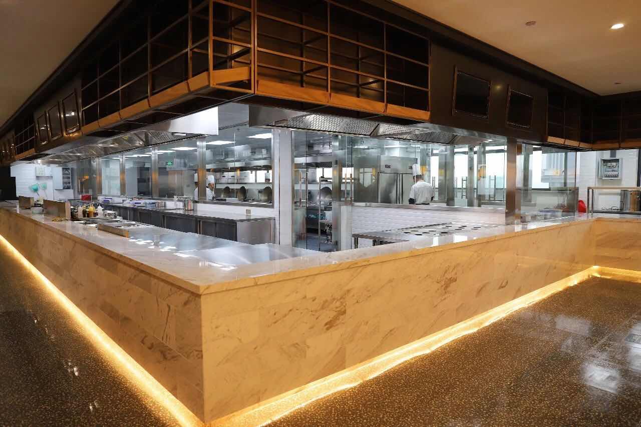 明檔設計相當于一個舞臺,意在讓顧客從不同角度觀賞一場食材的制作過程和廚師精湛廚藝結合的表演。在這個四面通透的舞臺下廚,如果吸力不夠,油煙容易往外跑,這樣一來便毫無觀賞感可言,明檔的美觀意義也隨之失去。
